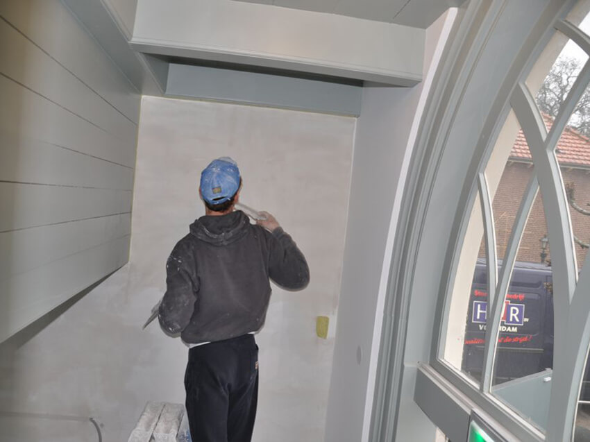 Op het begane grondniveau waren diverse schadeplekken met een lambrisering aan het oog onttrokken. Wij hebben meermaals ervaren dat bij extra vocht- en zoutbelasting in de muren het aanbrengen van een zoutbufferend pleistersysteem niet duurzaam is. Dat was dan ook de reden om in het genoemde project te zoeken naar alternatieven in overleg met het kerkbestuur en de aannemer.